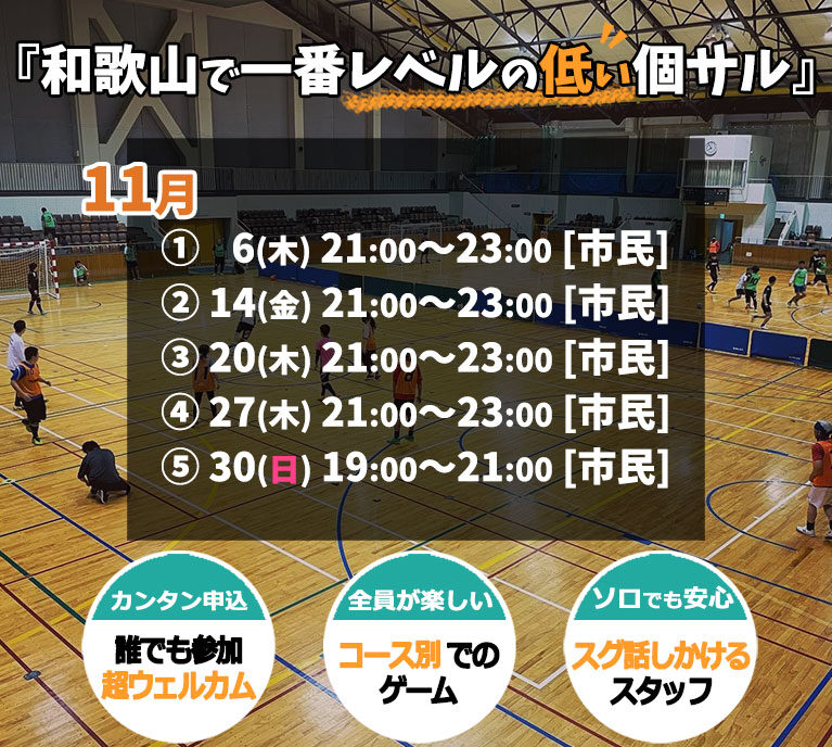 ラビサルワカヤマの個サルは河南体育館にて2時間、参加費ひとり1,300円で開催しています。